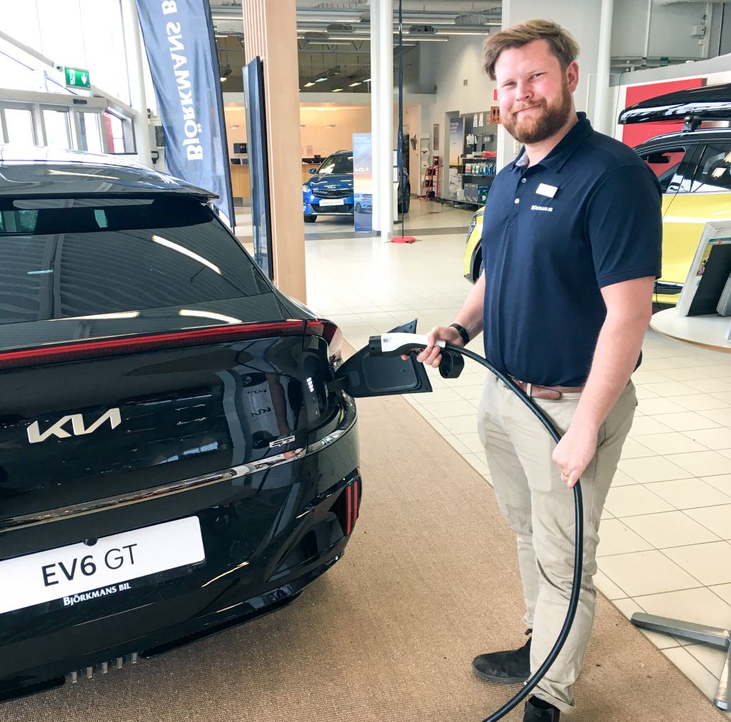Snabba laddningstider, modern teknik och låga driftkostnader har gjort att många kunder intresserar sig för laddbara bilar. Emil Andersson är säljare hos Björkmans Bils Kia-anläggning i Ludvika hjälper till och guidar bland Kias populäraste modeller.