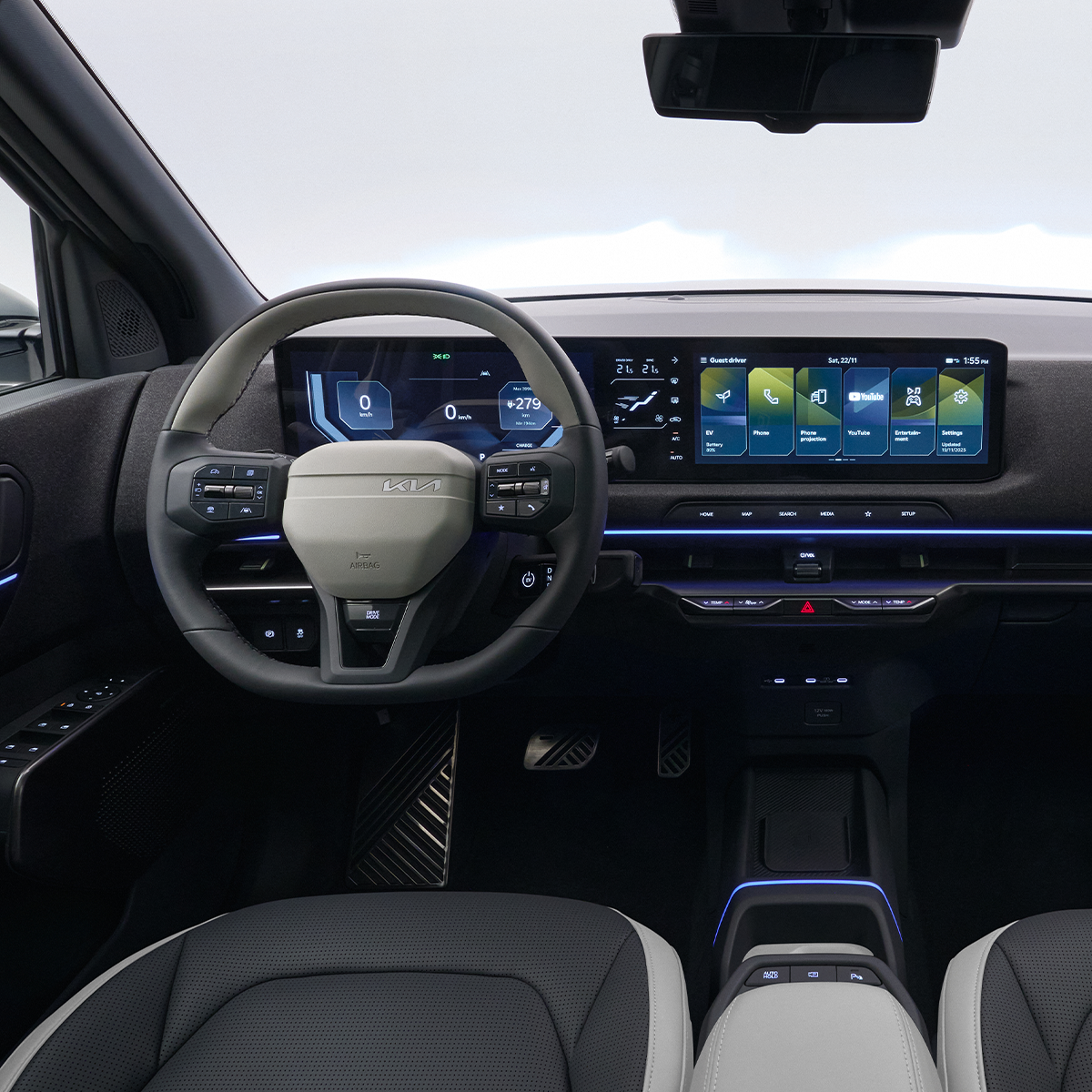 Interiören i Kia EV2 är utformad för att kännas luftig, funktionell och modern, med fokus på enkel användning och trygg körning.